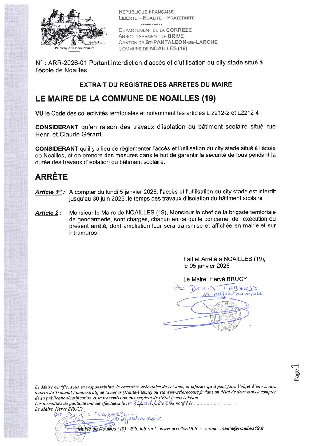 ARR-2026-01 PORTANT INTERDICTION D'ACCÈS ET D'UTILISATION DU CITY STADE SITUÉ À L'ÉCOLE DE NOAILLES